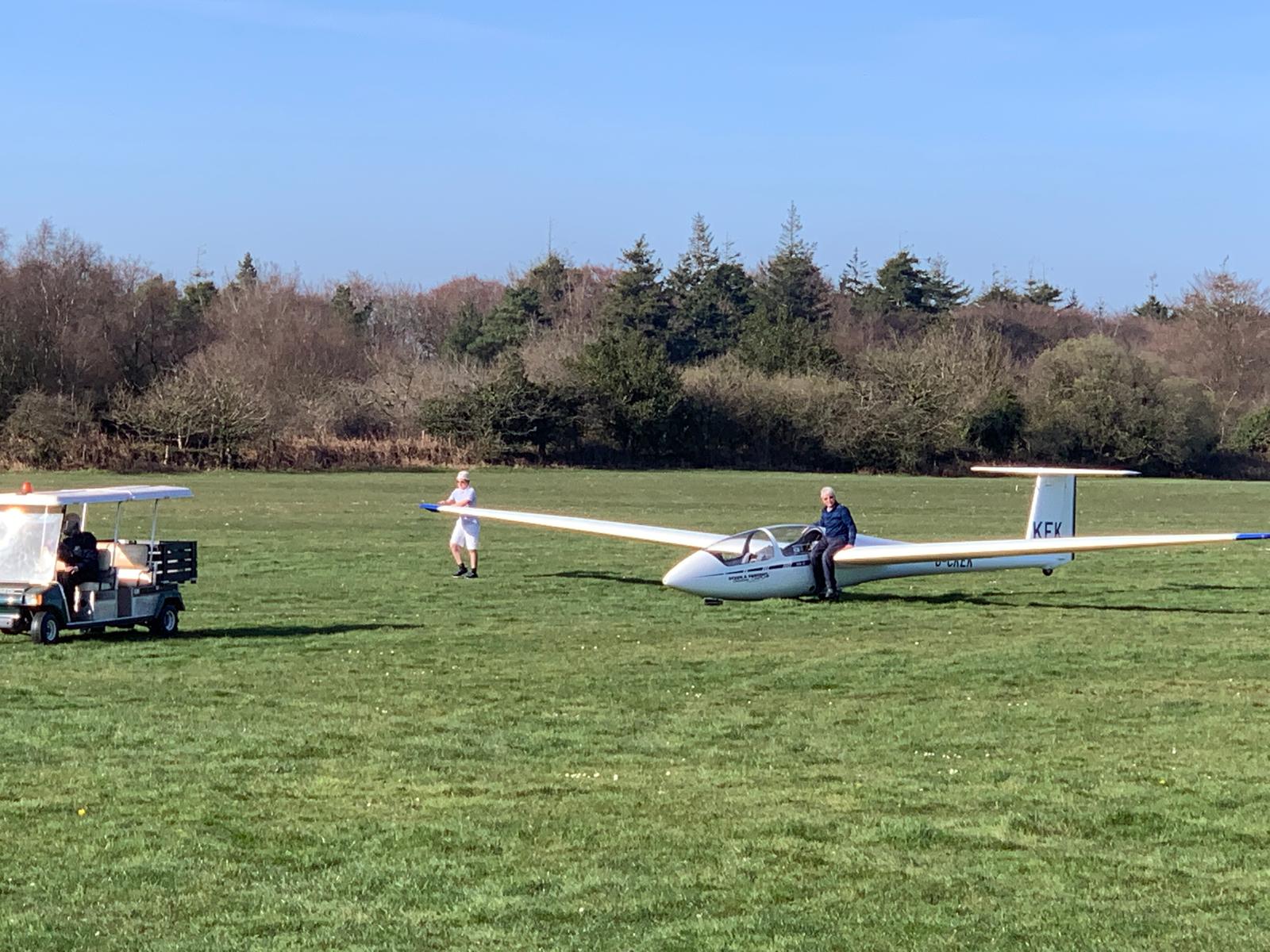 A Sunny day was forecast, although less chance of soaring meant the flying list was more manageable, but still with a fairly full clubhouse for the briefing. Duty Instructor, John Pursey set the airfield up at the west end.
