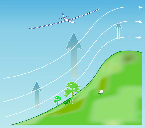 Ridge lift requires a hill with a steepish ridge, and the wind to blow against the face of it. When the wind hits the hill, it gets forced upwards.