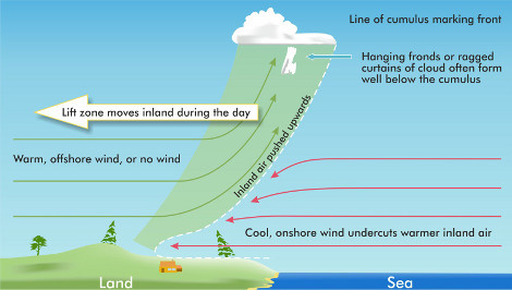 On many summer days when the land heats up faster than the sea, and in certain wind conditions, lines of convergence lift may set up parallel to the coasts.
