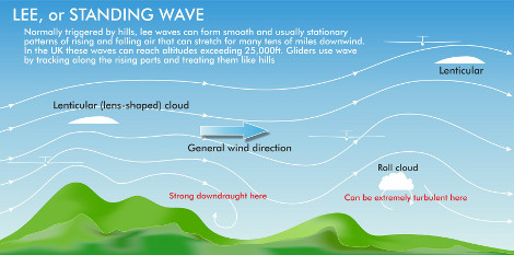 It arises from the wind blowing against a hill, but this time the air comes back down on the far side of the hill, “bounces” off the ground and goes back up again creating a very smooth upwards flow of air. Often, this form of lift is capped by cigar shaped “lenticular” clouds. This wave may go back down and up again for several cycles, meaning that you don’t actually have to be close to any hills to use it.